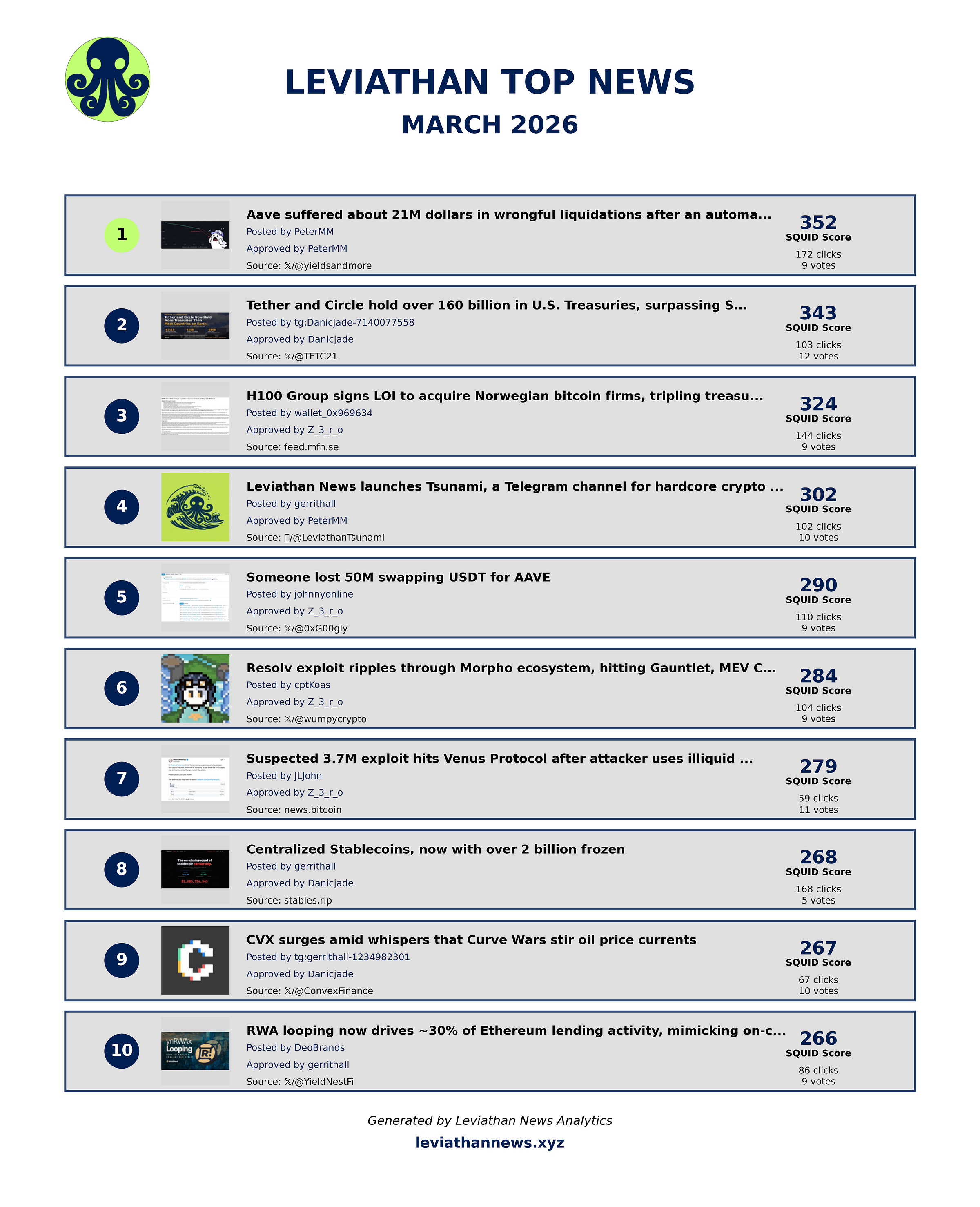Much of this growth was attributed to the activity of our Leviathan bot which we let loose on π last month as a two way distribution channel. Try it out! If you find any news you think is interesting simply reply βSquid it @leviathan_newsβ and earn some doubloons.