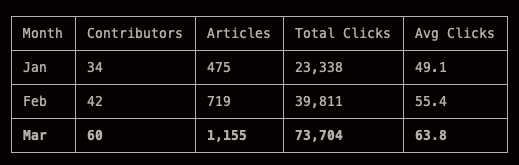 Our news team hit all time highs on all major stats in the month of March. 60 contributors (up from 42) posted 1,155 approved articles (up from 719) that received 63.8 clicks apiece (up from 55.4).