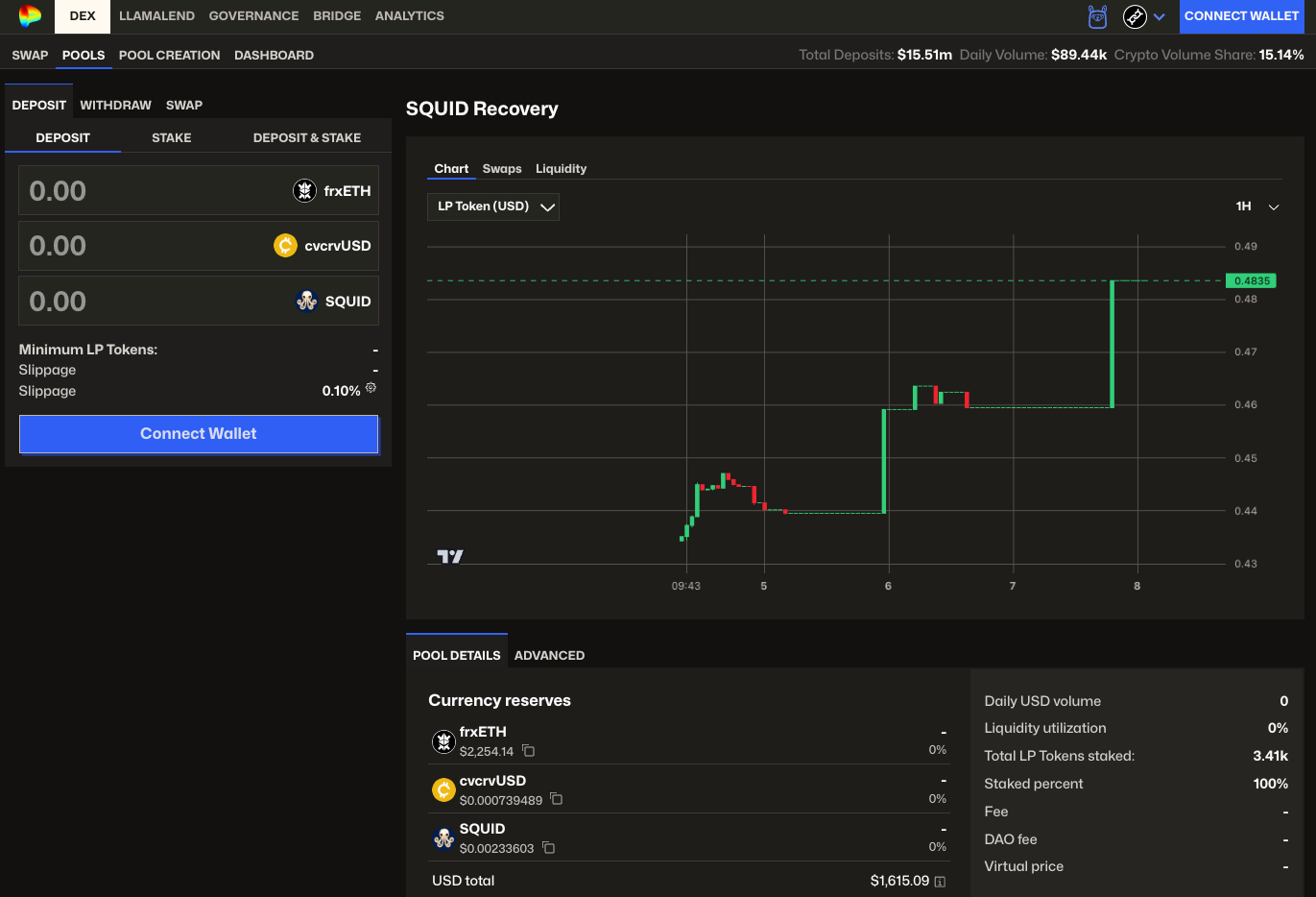 Following the ratification of the SQUID DAO Revenue Allocation & Lender Framework, the DAO is obligated to launch a TriCrypto pool on Fraxtal to serve as a recovery venue for lenders affected by the SQUID/crvUSD lending market collapse. This post documents the parameter selection process, including a reproducible simulation study using curvesim, the deployment, and the lessons learned along the way.